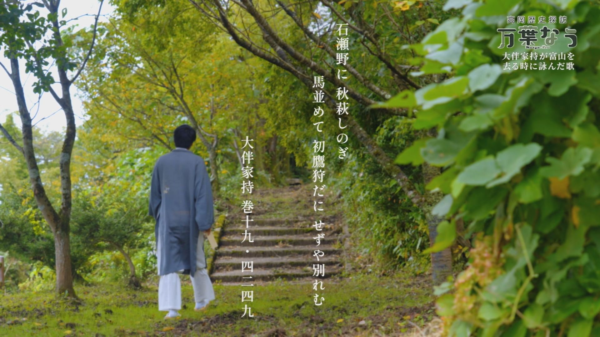 現代感覚で万葉集を楽しむ番組です。ショートフィルムは、大伴坂上大嬢の「わが業れる 早稲田の稲立 作りたる 蘰そ見つつ 偲はせわが背」(巻八・一六二四)です。高岡の歌は「石瀬野に 秋萩しのぎ 馬並めて 初鷹狩だに せずや別れむ」(巻十九・四二四九)です。地元の小学校で振りを付けて詠われている珍しい歌です。万葉さんぽは野村。地元の人たちに愛されるお店「お食事処 しぶや」にお邪魔してきました。 出演:新谷秀夫(高岡市万葉歴史館)